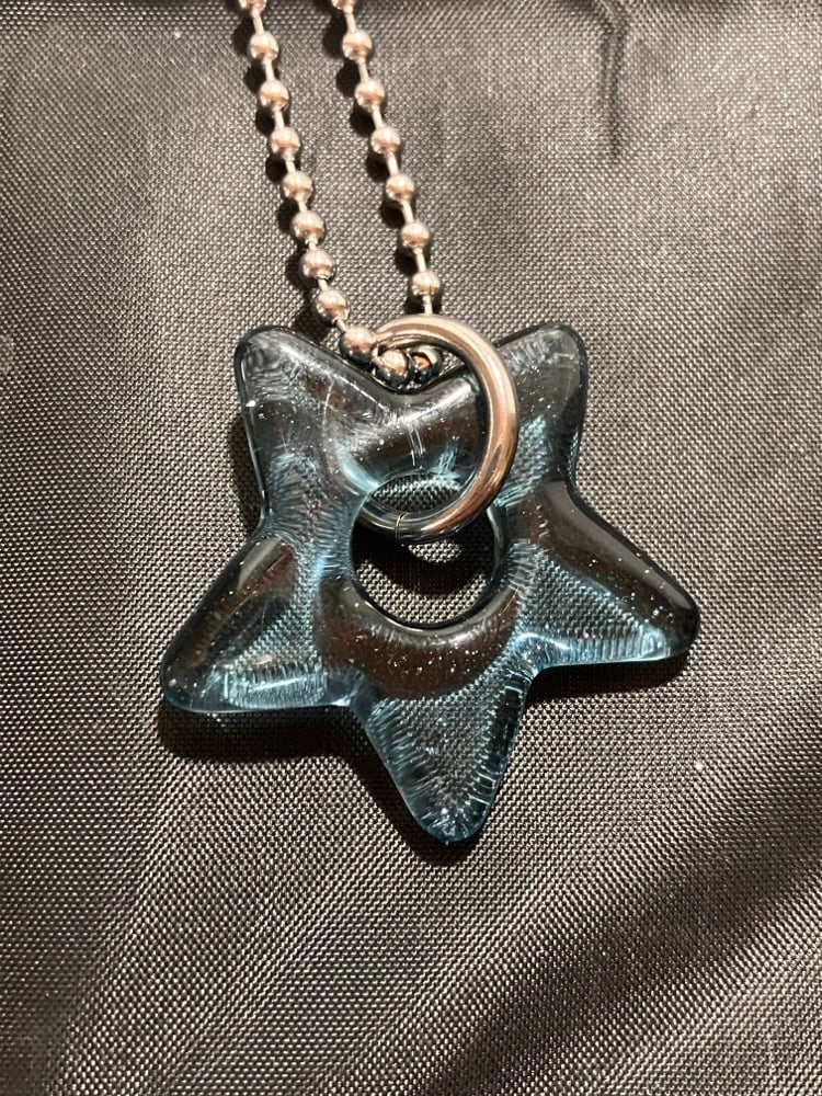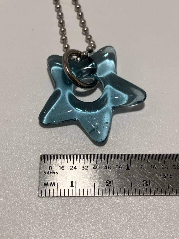 translucent sparkly blue borosilicate glass star pendant. comes with stainless steel jump ring and 24" ball chain (can be trimmed shorter)