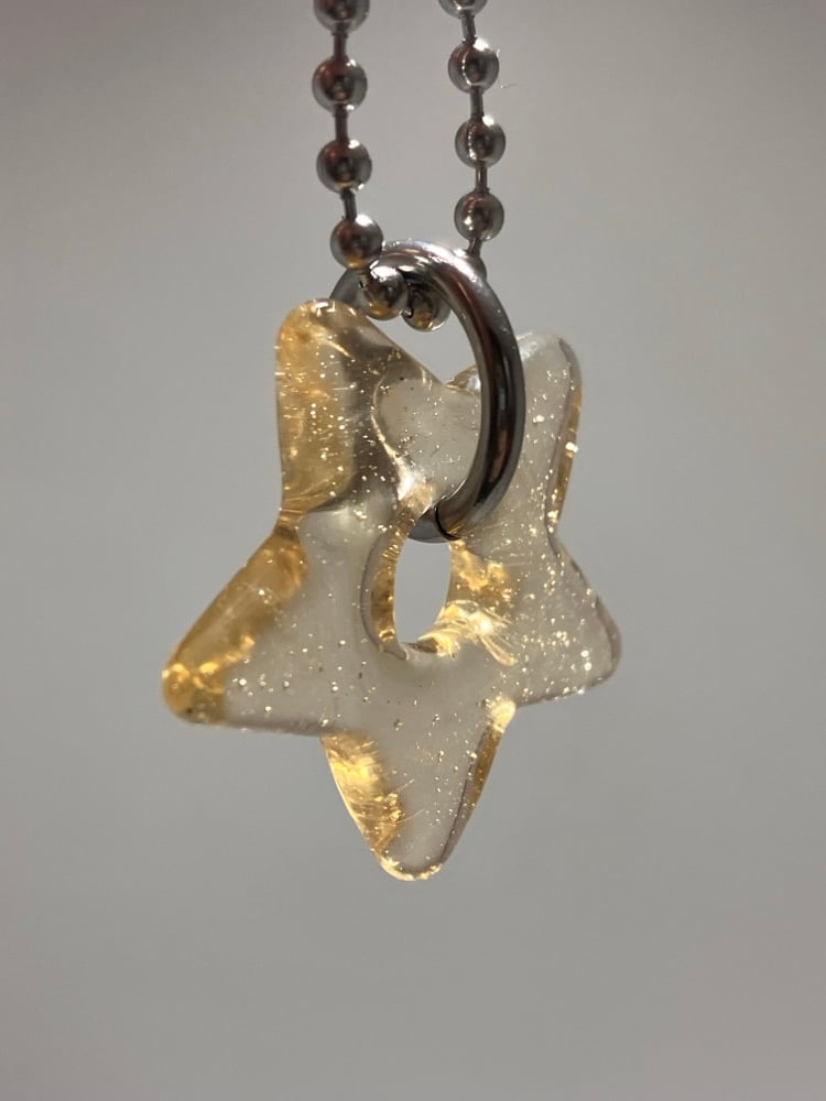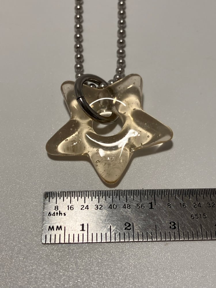 champagne colored borosilicate glass star pendant. comes with stainless steel jump ring and 24" ball chain (can be trimmed shorter)