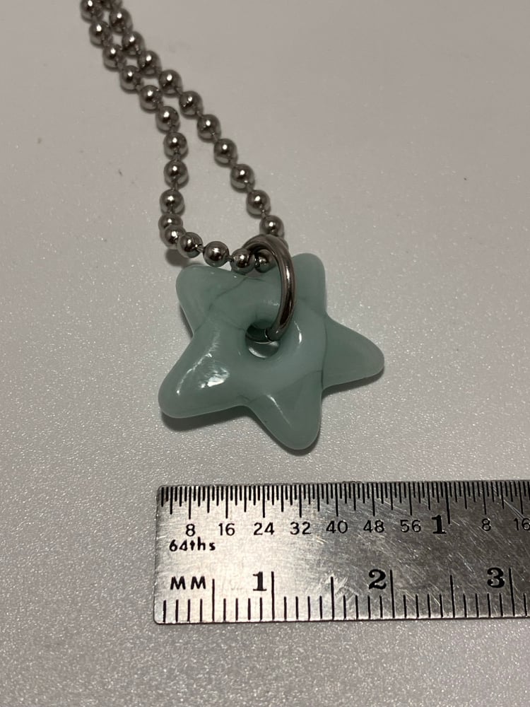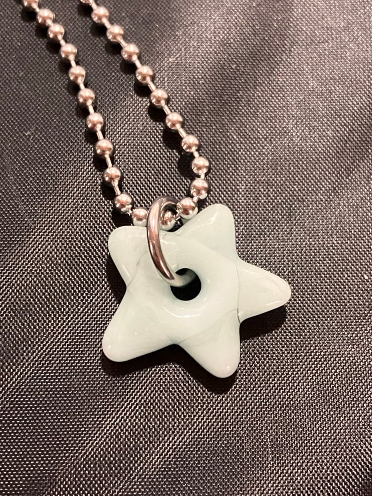 opaque light blue borosilicate glass star pendant. comes with stainless steel jump ring and 24" ball chain (can be trimmed shorter)