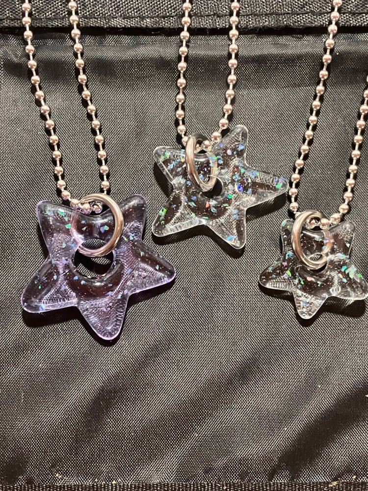 crushed opal borosilicate glass star pendant. comes with stainless steel jump ring and 24" ball chain (can be trimmed shorter)