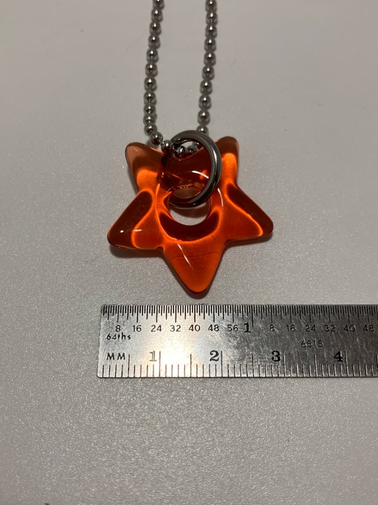 translucent orange borosilicate glass star pendant. comes with stainless steel jump ring and 24" ball chain (can be trimmed shorter)