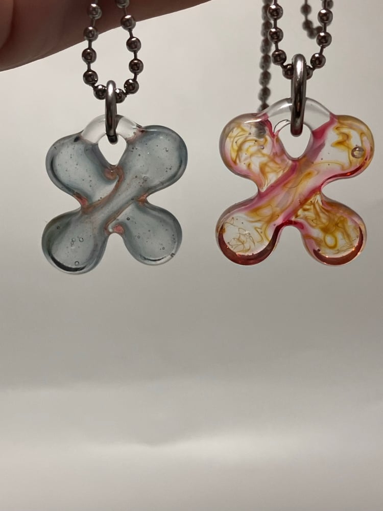 borosilicate glass clover pendant coldworked flat. comes with stainless steel jump ring and 24" ball chain (can be trimmed shorter)