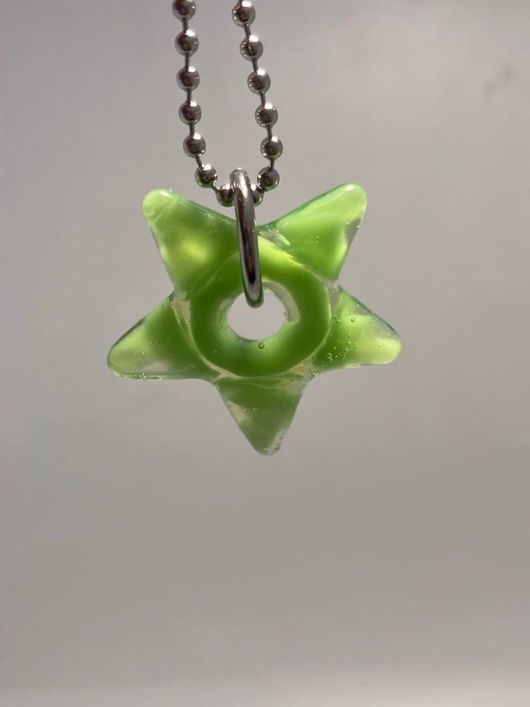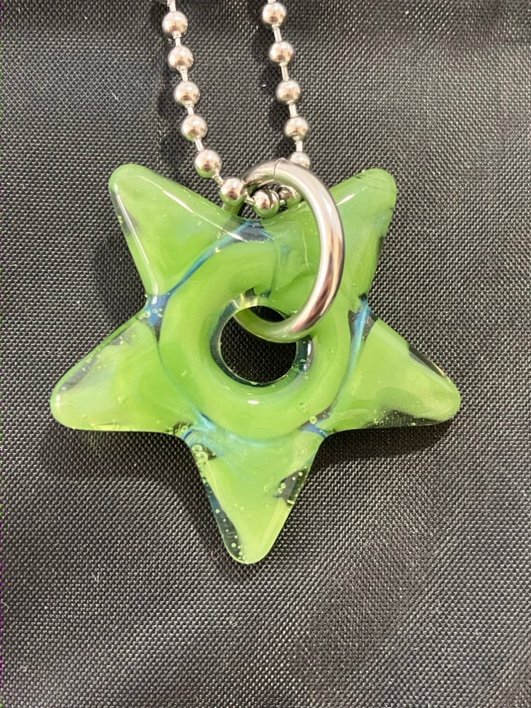 opaque green with opaline layer borosilicate glass star pendant. comes with stainless steel jump ring and 24" ball chain (can be trimmed shorter)