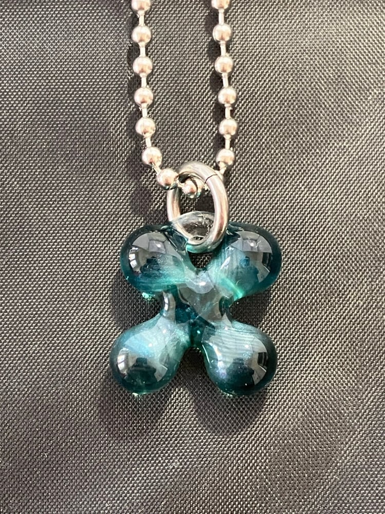 metallic blue borosilicate glass clover pendant. comes with stainless steel jump ring and 24" ball chain (can be trimmed shorter)