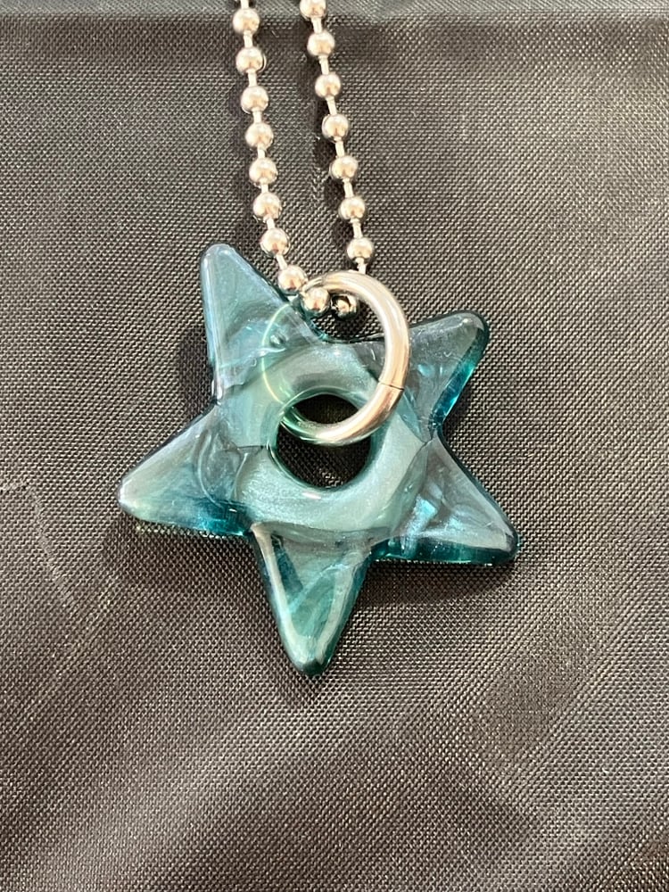 translucent metallic blue borosilicate glass star pendant. comes with stainless steel jump ring and 24" ball chain (can be trimmed shorter)
