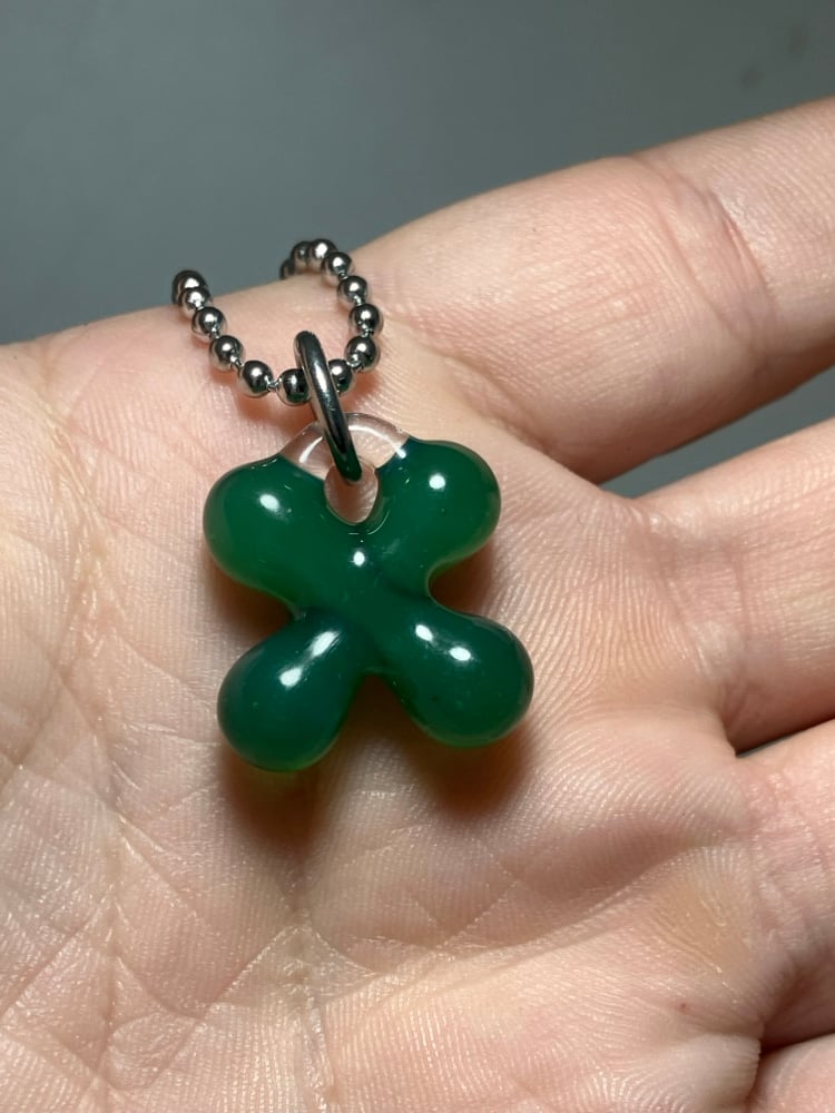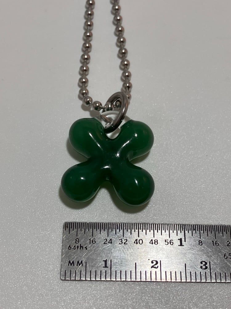 semi translucent green borosilicate glass clover pendant. comes with stainless steel jump ring and 24" ball chain (can be trimmed shorter)