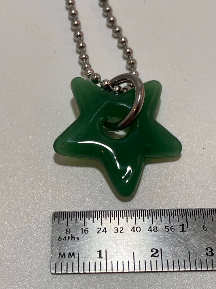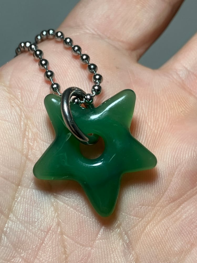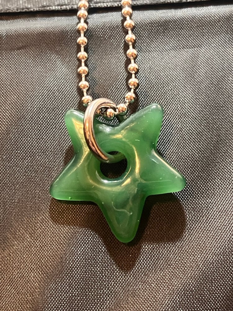 semi translucent green borosilicate glass star pendant. comes with stainless steel jump ring and 24" ball chain (can be trimmed shorter)